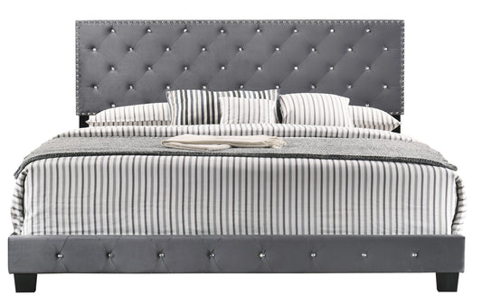 Upholstered Bed features a Faux Crystal Jeweled Tufted Velvet Cover