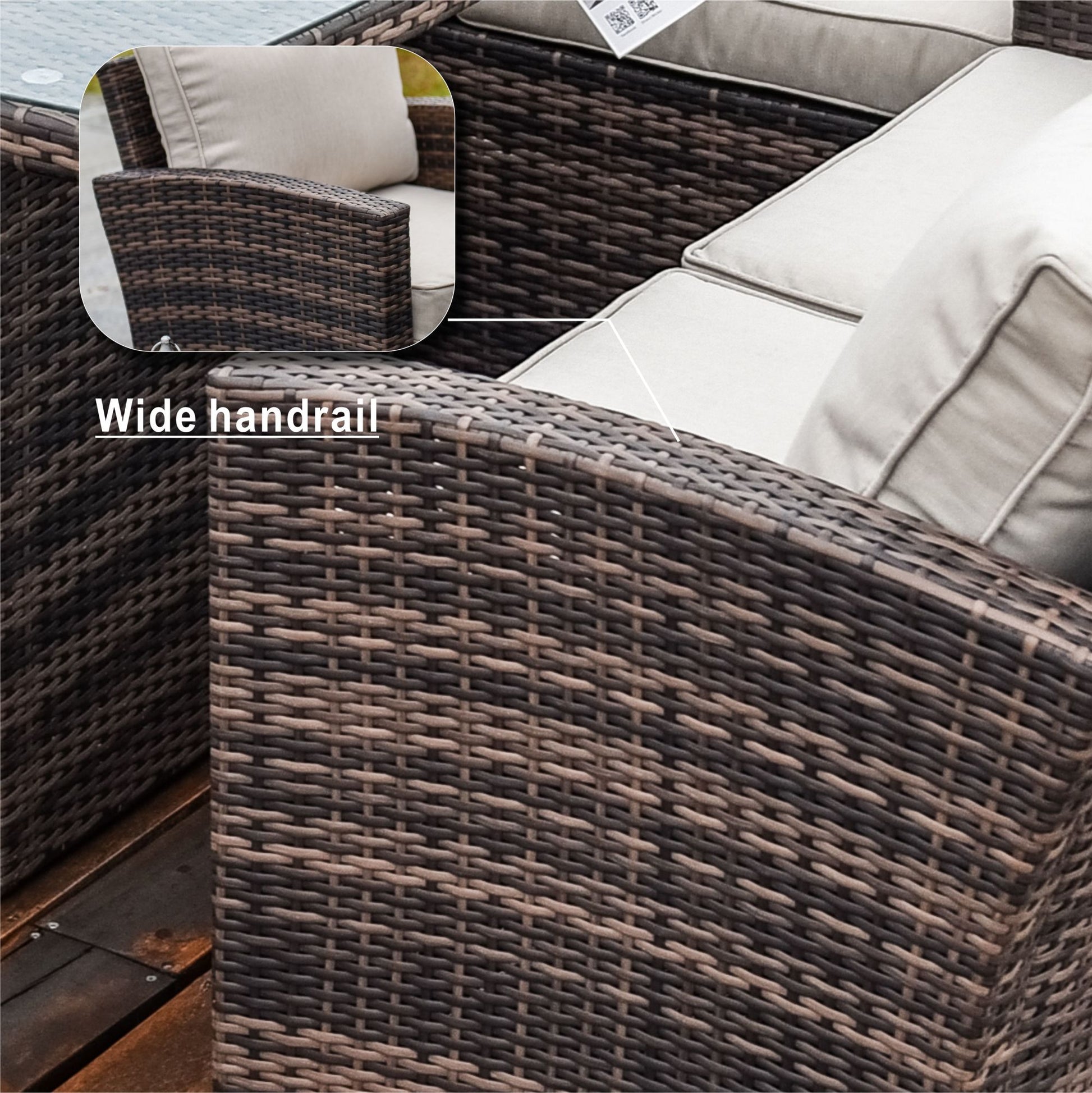 1. Product Description -This patio furniture set is woven by hand of Commercial Grade all-weather wicker strands; and then wrapped around a sturdy yet lightweight steel frame. The table comes with a removable tempered glass adding a sophisticated touch and allowing you to place drinks; meals; or decorative items on top. 1 three-seat sofa 1 double sofa 1 single sofa are all thick lofty sponge padded for more comfort and relaxation. You'll appreciate its beauty and durability as well as your guests' compliments on it! Our wicker is strong and durable but also light weight at the same time. Repositioning the set is easy and convenient so you can easily change your set's configuration at any time. -All cushions and pillows are removable for easy cleaning. If you accidently spill on your cushions or if dirt accumulates over time you can give them a quick wash to have them looking brand new. - Wide Cabinet with PP board; with liner